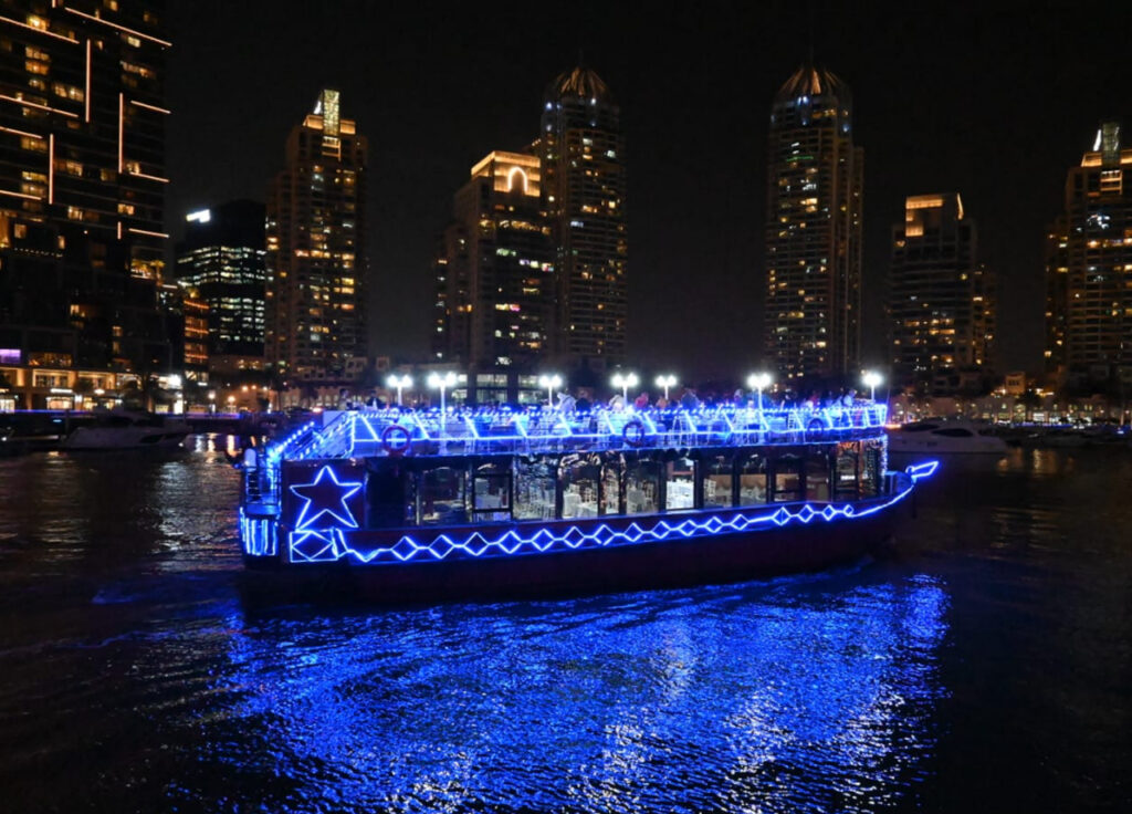 Our New Year cruise Dubai packages are designed to make your night unforgettable. Each cruise includes a lavish gala dinner featuring an array of international dishes, fresh seafood, and traditional Arabic delicacies. As you dine under the stars, live entertainment and festive music set the perfect mood for celebration. Aboard the New Year fireworks cruise Dubai, you’ll be treated to unlimited refreshments, attentive service, and front-row seats to the city’s most spectacular shows.